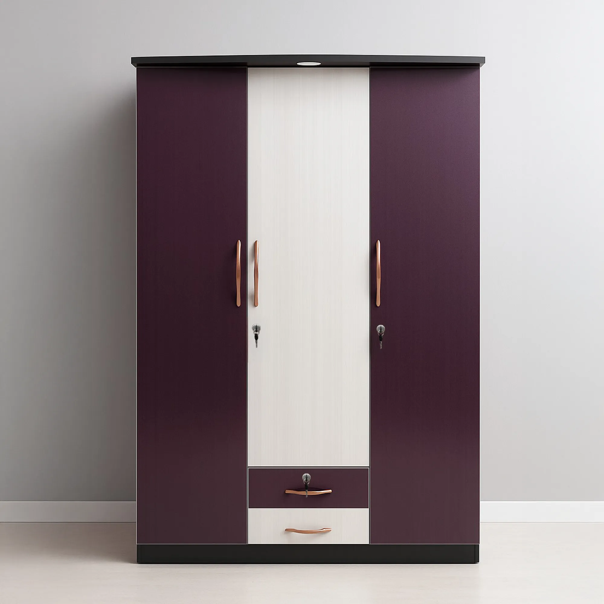 Make a bold, modern statement with the Aubergine DuoTone 3-Door Wardrobe with Center Panel & Dual Drawers – Plum & Ivory. This engineered-wood almirah pairs rich plum sides with a sleek ivory center panel, accented by long metal handles and a clean black plinth/top. The scratch-resistant laminate is easy to maintain, while individual lock-and-key doors keep valuables secure.